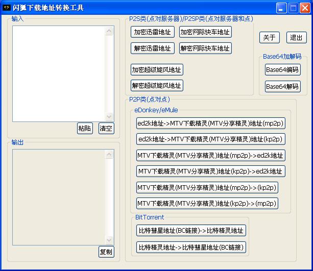 该工具可转换常见下载工具和BT工具的地址,以便在没有特定下载工具时一样可完成下载!目前支持迅雷,网际快车,QQ旋风,比特彗星地址(BC链接),比特精灵,ed2k地址,MTV下载精灵(MTV分享精灵)!应该目前是网上支持最多专用链接的地址链转换工具!