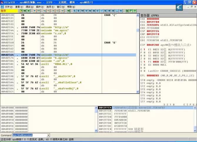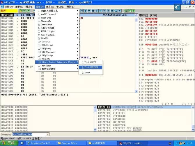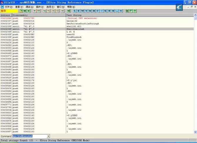 首先用PEID查壳,发现程序未加壳,开发工具为Microsoft Visual Basic 5.0 / 6.0 2.动态分析 用OD载入”aysMH告别版.exe”,用OD插件 Ultra String Reference查找有关的字符