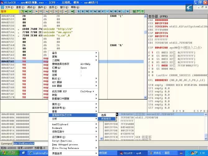 另一个是”http://mh.ayssss.cn/",弹出的网页地址. 分别在两个参考处下断,对于第一个关键字符引用处,我在离它前面近的跳转处修改汇编代码,把跳转nop掉,然后保存下修改的程序,发现网页是不弹了,但是会弹出个错误提示,虽然不影响功能,但是很不美观.这个大家可以自己试,也可能是我方法不对把….